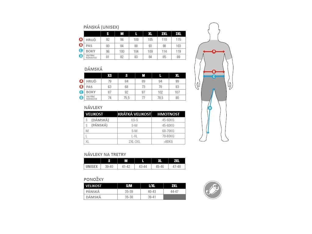 materiál Sitip Velo Light na rukávech 3D síťovina pro lepší odvětrání zip YKK® Vislon® s taháčkem Castelli scorpion silikonové zakončení v pase 3 zadní kapsy