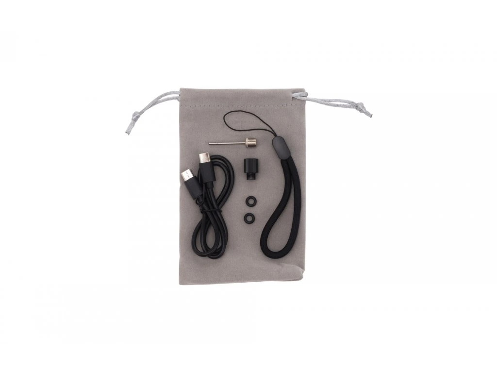 Součástí je přepravní sáček, adaptér na presta ventil, adaptér na míče, prodlužovací hadička, USB-C kabel